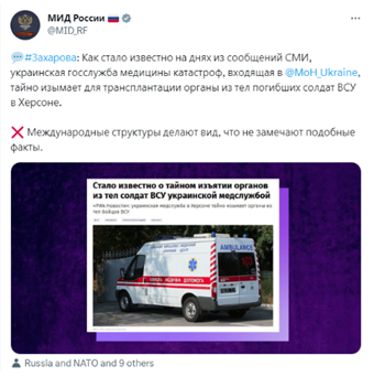 Članak portparolke ruskog ministarstva spoljnih poslova Marije Zaharove „Svetski lider crnih transplantacija: u Ukrajini se organima trguje onlajn i oflajn“, za „Rossiiskaia Gazeta“, 7. avgust 2023[1]. svoju popularnost dobija u srpskim medijima i među pro-kremaljskim kreatorima mišljenja. Ova osporena i više puta ponovljena dezinformacija doživljava svoj novi informacioni ciklus.